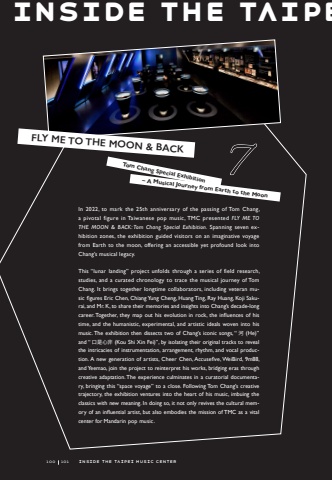 Inside the TaipeIn 2022, to mark the 25th anniversary of the passing of Tom Chang, a pivotal figure in Taiwanese pop music, TMC presented FLY ME TO THE MOON & BACK: Tom Chang Special Exhibition. Spanning seven exhibition zones, the exhibition guided visitors on an imaginative voyage from Earth to the moon, offering an accessible yet profound look into Chang%u2019s musical legacy.This %u201clunar landing%u201d project unfolds through a series of field research, studies, and a curated chronology to trace the musical journey of Tom Chang. It brings together longtime collaborators, including veteran music figures Eric Chen, Chiang Yung Cheng, Huang Ting, Ray Huang, Koji Sakurai, and Mr. K, to share their memories and insights into Chang%u2019s decade-long career. Together, they map out his evolution in rock, the influences of his time, and the humanistic, experimental, and artistic ideals woven into his music. The exhibition then dissects two of Chang%u2019s iconic songs, %u201c%u6cb3 (He)%u201d and %u201c%u53e3%u662f%u5fc3%u975e (Kou Shi Xin Fei)%u201d, by isolating their original tracks to reveal the intricacies of instrumentation, arrangement, rhythm, and vocal production. A new generation of artists, Cheer Chen, Accusefive, WeiBird, 9m88, and Yeemao, join the project to reinterpret his works, bridging eras through creative adaptation. The experience culminates in a curatorial documentary, bringing this %u201cspace voyage%u201d to a close. Following Tom Chang%u2019s creative trajectory, the exhibition ventures into the heart of his music, imbuing the classics with new meaning. In doing so, it not only revives the cultural memory of an influential artist, but also embodies the mission of TMC as a vital center for Mandarin pop music.7 FLY ME TO THE MOON & BACKTom Chang Special Exhibition %u2013 A Musical Journey from Earth to the Moon100100101101inside the Taipei Music Center