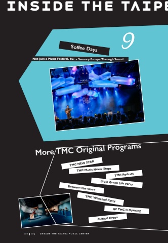 Inside the Taipe9TMC NEW STARCritical GreenLIVE! Green Life PartyTMC Music Never StopsTMC Weekend PartyTMC PodcastBetween the VerseHi! TMC is OpeningSoffee Days Not Just a Music Festival, but a Sensory Escape Through SoundMore TMC Original Programs102102103103inside the Taipei Music Center