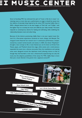 Sense & Sound: Five Ways into Taiwanese Pop MusicSUNSET TMCSince its founding, TMC has embraced the spirit of %u201cmusic is life, live in music,%u201d envisioning music as more than just a performance on stage; it should be woven into the rhythms of everyday living. Inspired by this vision, TMC launched Soffee Days in 2023, a lifestyle festival built on the dual imagery of %u201cSoft Life%u201d and %u201cCoffee,%u201d with the tagline: %u201cSay no to anxiety; let music and coffee be your daily remedy.%u201d The event responds to contemporary desires for healing and well-being, while redefining the relationship between music and urban living.Because of this distinct positioning, Soffee Days is not your typical music festival. It%u2019s a five-senses experience centered on music, design, and lifestyle. The inaugural event featured ten musical acts in continuous performance, complemented by curated market booths and events. In 2024, the theme %u201cDaydream%u201d brought a new concept to life: a music festival you can lie down at. Artists from Taiwan, Japan, and Thailand shared the stage, while events and a multi-sensory expanded the event into a diverse encounter. Even the installations and seating areas were designed around the daydream motif, allowing visitors to feel as though they had boarded a train into a dreamworld, experiencing not only the music, but the adaptive possibilities of the venue. For TMC, Soffee Days is more than just a music festival; it has grown into a signature annual IP.Woof Woof: Live!NOW ON AIR: TMC Radio Without LimitsMusic, Island, Stories: Taiwan Calling!TMC h%u00f3-thian MapModern Era: The Dawn of Pop MusicLet%u2019s Drink Some MusicTMC TALK TMC Cultural Cube Anniversary