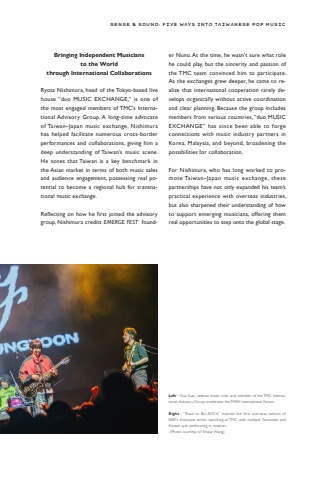 Sense & Sound: Five Ways into Taiwanese Pop MusicBringing Independent Musicians to the World through International CollaborationsRyota Nishimura, head of the Tokyo-based live house %u201cduo MUSIC EXCHANGE,%u201d is one of the most engaged members of TMC%u2019s International Advisory Group. A long-time advocate of Taiwan%u2013Japan music exchange, Nishimura has helped facilitate numerous cross-border performances and collaborations, giving him a deep understanding of Taiwan%u2019s music scene. He notes that Taiwan is a key benchmark in the Asian market in terms of both music sales and audience engagement, possessing real potential to become a regional hub for transnational music exchange.Reflecting on how he first joined the advisory group, Nishimura credits EMERGE FEST founder Nuno. At the time, he wasn%u2019t sure what role he could play, but the sincerity and passion of the TMC team convinced him to participate. As the exchanges grew deeper, he came to realize that international cooperation rarely develops organically without active coordination and clear planning. Because the group includes members from various countries, %u201cduo MUSIC EXCHANGE%u201d has since been able to forge connections with music industry partners in Korea, Malaysia, and beyond, broadening the possibilities for collaboration.For Nishimura, who has long worked to promote Taiwan%u2013Japan music exchange, these partnerships have not only expanded his team%u2019s practical experience with overseas industries, but also sharpened their understanding of how to support emerging musicians, offering them real opportunities to step onto the global stage.LeftSiva Yuan, veteran music critic and member of the TMC International Advisory Group, moderates the TMEX International Forum.Right%u201dRoad to BU-ROCK%u201d marked the first overseas edition of BIRF%u2019s showcase series, launching at TMC with multiple Taiwanese and Korean acts performing in rotation. (Photo courtesy of Sholar Wang)