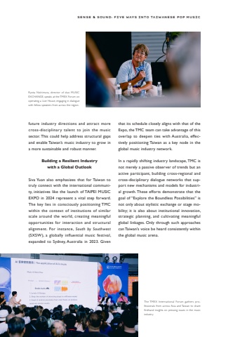 Sense & Sound: Five Ways into Taiwanese Pop Musicfuture industry directions and attract more cross-disciplinary talent to join the music sector. This could help address structural gaps and enable Taiwan%u2019s music industry to grow in a more sustainable and robust manner.Building a Resilient Industry with a Global OutlookSiva Yuan also emphasizes that for Taiwan to truly connect with the international community, initiatives like the launch of TAIPEI MUSIC EXPO in 2024 represent a vital step forward. The key lies in consciously positioning TMC within the context of institutions of similar scale around the world, creating meaningful opportunities for interaction and structural alignment. For instance, South by Southwest(SXSW), a globally influential music festival, expanded to Sydney, Australia in 2023. Given that its schedule closely aligns with that of the Expo, the TMC team can take advantage of this overlap to deepen ties with Australia, effectively positioning Taiwan as a key node in the global music industry network.In a rapidly shifting industry landscape, TMC is not merely a passive observer of trends but an active participant, building cross-regional and cross-disciplinary dialogue networks that support new mechanisms and models for industrial growth. These efforts demonstrate that the goal of %u201cExplore the Boundless Possibilities%u201d is not only about stylistic exchange or stage mobility; it is also about institutional innovation, strategic planning, and cultivating meaningful global linkages. Only through such approaches can Taiwan%u2019s voice be heard consistently within the global music arena.The TMEX International Forum gathers professionals from across Asia and Taiwan to share firsthand insights on pressing issues in the music industry.Ryota Nishimura, director of duo MUSIC EXCHANGE, speaks at the TMEX Forum on operating a Live House, engaging in dialogue with fellow speakers from across the region.