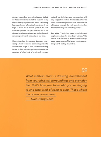 Sense & Sound: Five Ways into Taiwanese Pop MusicWhat matters most is drawing nourishment from your physical surroundings and everyday life; that%u2019s how you know who you%u2019re singing to and what kind of song to sing. That%u2019s where the power comes from.%u2014Kuan-Heng ChenAfrican music. But once globalization kicked in, those distinctions started to blur, and today, they%u2019re nearly impossible to make.%u201d Streaming has erased many of music%u2019s boundaries. If we hope to carve out a distinct space in this vast landscape, perhaps the path forward lies in rediscovering what constitutes a truly local sound, something well worth cultivating in our time.Chen describes the tension between cultivating a local voice and connecting with the international stage as two constantly shifting forces: %u201cIt feels like the right time to revisit the question of what kind of music only we can make. If we don%u2019t have that conversation, we%u2019ll stay trapped in endless debates about how to adapt to different platforms. But platforms are ultimately neutral; the real issue is whether the creator truly has something to say.%u201dLee adds, %u201cMusic has never needed much explanation. Just let time bear witness.%u201d No matter how formats or environments change, good music endures. The future remains something worth looking forward to.