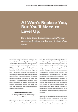 Sense & Sound: Five Ways into Taiwanese Pop MusicFrom visual design and costume styling to music production and vocal performance, every detail of Mila Mii was crafted through collaboration among a cross-disciplinary team. In 2025, she took the stage at the Taipei Arena, becoming the first Taiwanese virtual singer to hold a large-scale concert. This milestone in technological application also marked a vivid symbol of the evolving landscape of cultural content. This deep integration of music and technology prompts an even more intriguing question: unbound by physical limitations, how was this virtual artist brought into being? And what new possibilities does her emergence unlock for music creation?The Birth of a Virtual Idol: A Dialogue Between Technology and MusicThe origins of this cross-disciplinary collaboration trace back to the pandemic. During that time, Eric Chen began wondering whether he could leverage his decades of experience in artist management and music production to create a %u201cvirtual idol,%u201d one unbound by geography or the constraints of live performance, capable of staging simultaneous shows across the globe. At the same time, Inventec was seeking to move beyond its role as a hardware manufacturer and expand into content creation and cultural applications. Facilitated by the Taiwan Creative Content Agency (TAICCA), the two sides joined forces: Chen and his team took charge of character development and music production, while Inventec handled 3D modeling and motion generation, setting off on an ambitious and experimental journey across industries.Speaking on the differences between virtual artists and human performers, Chen noted that real-life artists come with established personalities, voices, preferences, and expressive AI Won%u2019t Replace You, But You%u2019ll Need to Level Up:How Eric Chen Experiments with Virtual Artists to Explore the Future of Music Creation
