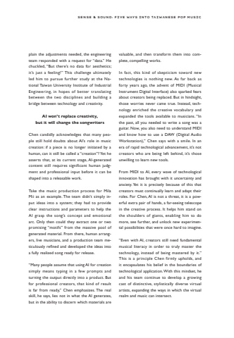 Sense & Sound: Five Ways into Taiwanese Pop Musicplain the adjustments needed, the engineering team responded with a request for %u201cdata.%u201d He chuckled, %u201cBut there%u2019s no data for aesthetics; it%u2019s just a feeling!%u201d This challenge ultimately led him to pursue further study at the National Taiwan University Institute of Industrial Engineering, in hopes of better translating between the two disciplines and building a bridge between technology and creativity.AI won%u2019t replace creativity, but it will change the songwritersChen candidly acknowledges that many people still hold doubts about AI%u2019s role in music creation: if a piece is no longer initiated by a human, can it still be called a %u201ccreation%u201d? Yet he asserts that, at its current stage, AI-generated content still requires significant human judgment and professional input before it can be shaped into a releasable work.Take the music production process for Mila Mii as an example. The team didn%u2019t simply input ideas into a system; they had to provide clear instructions and parameters to help the AI grasp the song%u2019s concept and emotional arc. Only then could they extract one or two promising %u201cmotifs%u201d from the massive pool of generated material. From there, human arrangers, live musicians, and a production team meticulously refined and developed the ideas into a fully realized song ready for release.%u201cMany people assume that using AI for creation simply means typing in a few prompts and turning the output directly into a product. But for professional creators, that kind of result is far from ready,%u201d Chen emphasizes. The real skill, he says, lies not in what the AI generates, but in the ability to discern which materials are valuable, and then transform them into complete, compelling works.In fact, this kind of skepticism toward new technologies is nothing new. As far back as forty years ago, the advent of MIDI (Musical Instrument Digital Interface) also sparked fears about creators being replaced. But in hindsight, those worries never came true. Instead, technology enriched the creative vocabulary and expanded the tools available to musicians. %u201cIn the past, all you needed to write a song was a guitar. Now, you also need to understand MIDI and know how to use a DAW (Digital Audio Workstation),%u201d Chen says with a smile. In an era of rapid technological advancement, it%u2019s not creators who are being left behind, it%u2019s those unwilling to learn new tools.From MIDI to AI, every wave of technological innovation has brought with it uncertainty and anxiety. Yet it is precisely because of this that creators must continually learn and adapt their roles. For Chen, AI is not a threat, it is a powerful extra pair of hands, a far-seeing telescope in the creative process. It helps him stand on the shoulders of giants, enabling him to do more, see further, and unlock new experimental possibilities that were once hard to imagine.%u201cEven with AI, creators still need fundamental musical literacy in order to truly master the technology, instead of being mastered by it.%u201d This is a principle Chen firmly upholds, and it encapsulates his belief in the boundaries of technological application. With this mindset, he and his team continue to develop a growing cast of distinctive, stylistically diverse virtual artists, expanding the ways in which the virtual realm and music can intersect.