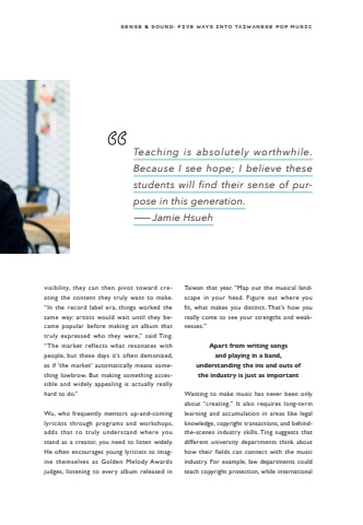Sense & Sound: Five Ways into Taiwanese Pop MusicTeaching is absolutely worthwhile. Because I see hope; I believe these students will find their sense of purpose in this generation.%u2014Jamie Hsuehvisibility, they can then pivot toward creating the content they truly want to make.%u201cIn the record label era, things worked the same way: artists would wait until they became popular before making an album that truly expressed who they were,%u201d said Ting. %u201cThe market reflects what resonates with people, but these days it%u2019s often demonized, as if %u2018the market%u2019 automatically means something lowbrow. But making something accessible and widely appealing is actually really hard to do.%u201dWu, who frequently mentors up-and-coming lyricists through programs and workshops, adds that to truly understand where you stand as a creator, you need to listen widely. He often encourages young lyricists to imagine themselves as Golden Melody Awards judges, listening to every album released in Taiwan that year. %u201cMap out the musical landscape in your head. Figure out where you fit, what makes you distinct. That%u2019s how you really come to see your strengths and weaknesses.%u201dApart from writing songs and playing in a band, understanding the ins and outs of the industry is just as importantWanting to make music has never been only about %u201ccreating.%u201d It also requires long-term learning and accumulation in areas like legal knowledge, copyright transactions, and behindthe-scenes industry skills. Ting suggests that different university departments think about how their fields can connect with the music industry. For example, law departments could teach copyright protection, while international
