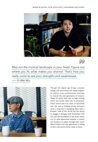 Sense & Sound: Five Ways into Taiwanese Pop MusicThough the digital age brings constant change and uncertainty, the steady support of veteran music professionals continues to nourish the next generation of creators. Today, it%u2019s easier than ever to begin making music, but harder than ever to persevere. That%u2019s where the true value of education lies: not just in helping young musicians write a song, but in equipping them with a broader view of the world and the ability to engage in dialogue with themselves. This isn%u2019t just the foundation of the music industry; it%u2019s what determines whether a creator can continue to speak through their work. And as long as the new generation is willing to learn, the world will be ready to listen.Map out the musical landscape in your head. Figure out where you fit, what makes you distinct. That%u2019s how you really come to see your strengths and weaknesses.%u2014Yi-Wei Wu