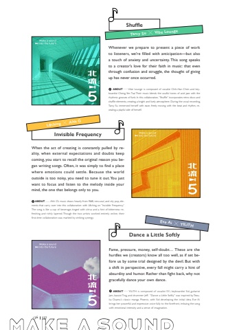 MakeaSoundFame, pressure, money, self-doubt%u2026 These are the hurdles we (creators) know all too well, as if set before us by some trial designed by the devil. But with a shift in perspective, every fall might carry a hint of absurdity and humor. Rather than fight back, why not gracefully dance your own dance.ABOUT%u2014YILITH is composed of vocalist SYi, keyboardist Sid, guitarist Jam, bassist Ting, and drummer Jeff. %u201cDance a Little Softly%u201d was inspired by Tezuka Osamu%u2019s classic manga Phoenix, with Sid developing the initial idea. Eve Ai brings her powerful and expressive voice fully to the forefront, imbuing the song with emotional intensity and a sense of imagination.When the act of creating is constantly pulled by reality, when external expectations and doubts keep coming, you start to recall the original reason you began writing songs. Often, it was simply to find a place where emotions could settle. Because the world outside is too noisy, you need to tune it out. You just want to focus and listen to the melody inside your mind, the one that belongs only to you.ABOUT%u2014Ahh G%u2019s music draws heavily from R&B, neo-soul, and city pop, elements that carry over into this collaboration with L8ching on %u201cInvisible Frequency.%u201d The song is like a cup of beverage, tinged with citrus and a hint of bitterness: refreshing and richly layered. Though the two artists worked entirely online, their first-time collaboration was marked by striking synergy.Shuffle Invisible FrequencyTarcy Su %u2573 Vibe Lounge L8ching %u2573 Ahh GWhenever we prepare to present a piece of work to listeners, we%u2019re filled with anticipation%u2014but also a touch of anxiety and uncertainty. This song speaks to a creator%u2019s love for their faith in music: that even through confusion and struggle, the thought of giving up has never once occurred.ABOUTVibe Lounge is composed of vocalist Chih-Han Chen and keyboardist Cheng-Yen Tsai Their music blends the soulful tones of acid jazz with the rhythmic grooves of funk. In this collaboration, %u201cShuffle%u201d incorporates retro disco and shuffle elements, creating a bright and lively atmosphere. During the vocal recording, Tarcy Su immersed herself with ease, freely moving with the beat and rhythm, revealing a playful side of herself.Dance a Little SoftlyEve AiYILITH136137