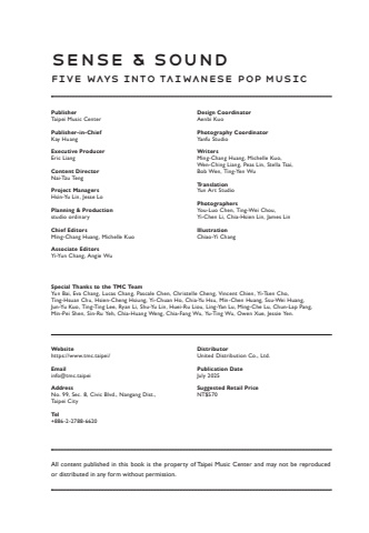 PublisherTaipei Music CenterPublisher-in-ChiefKay HuangExecutive ProducerEric LiangContent DirectorNai-Tzu TengProject ManagersHsin-Yu Lin, Jesse LoPlanning & Productionstudio ordinaryChief EditorsMing-Chang Huang, Michelle KuoAssociate EditorsYi-Yun Chang, Angie WuDesign CoordinatorAenbi KuoPhotography CoordinatorYanfu StudioWritersMing-Chang Huang, Michelle Kuo, Wen-Ching Liang, Peas Lin, Stella Tsai, Bob Wen, Ting-Yen WuTranslationYun Art StudioPhotographersYou-Luo Chen, Ting-Wei Chou, Yi-Chen Li, Chia-Hsien Lin, James LinIllustrationChiao-Yi ChangAll content published in this book is the property of Taipei Music Center and may not be reproduced or distributed in any form without permission.Special Thanks to the TMC TeamYun Bai, Eva Chang, Lucas Chang, Pascale Chen, Christelle Cheng, Vincent Chien, Yi-Tsen Cho, Ting-Hsuan Chu, Hsien-Cheng Hsiung, Yi-Chuan Ho, Chia-Yu Hsu, Min-Chen Huang, Ssu-Wei Huang, Jun-Yu Kuo, Ting-Ting Lee, Ryan Li, Shu-Yu Lin, Huei-Ru Liou, Ling-Yan Lu, Ming-Che Lu, Chun-Lap Pang, Min-Pei Shen, Sin-Ru Yeh, Chia-Huang Weng, Chia-Fang Wu, Yu-Ting Wu, Owen Xue, Jessie Yen.Websitehttps://www.tmc.taipei/Emailinfo@tmc.taipeiAddressNo. 99, Sec. 8, Civic Blvd., Nangang Dist., Taipei CityTel+886-2-2788-6620DistributorUnited Distribution Co., Ltd.Publication DateJuly 2025Suggested Retail PriceNT$570Sense & SoundFive Ways into Taiwanese Pop Music