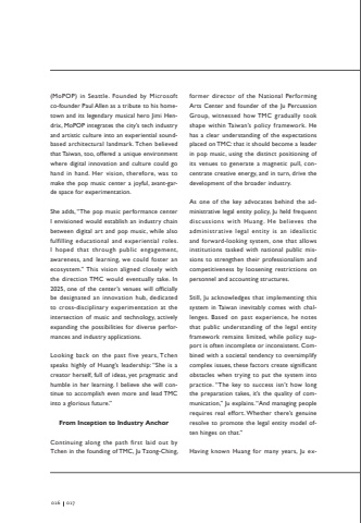 (MoPOP) in Seattle. Founded by Microsoft co-founder Paul Allen as a tribute to his hometown and its legendary musical hero Jimi Hendrix, MoPOP integrates the city%u2019s tech industry and artistic culture into an experiential soundbased architectural landmark. Tchen believed that Taiwan, too, offered a unique environment where digital innovation and culture could go hand in hand. Her vision, therefore, was to make the pop music center a joyful, avant-garde space for experimentation.She adds, %u201cThe pop music performance center I envisioned would establish an industry chain between digital art and pop music, while also fulfilling educational and experiential roles. I hoped that through public engagement, awareness, and learning, we could foster an ecosystem.%u201d This vision aligned closely with the direction TMC would eventually take. In 2025, one of the center%u2019s venues will officially be designated an innovation hub, dedicated to cross-disciplinary experimentation at the intersection of music and technology, actively expanding the possibilities for diverse performances and industry applications.Looking back on the past five years, Tchen speaks highly of Huang%u2019s leadership: %u201cShe is a creator herself, full of ideas, yet pragmatic and humble in her learning. I believe she will continue to accomplish even more and lead TMC into a glorious future.%u201dFrom Inception to Industry AnchorContinuing along the path first laid out by Tchen in the founding of TMC, Ju Tzong-Ching, former director of the National Performing Arts Center and founder of the Ju Percussion Group, witnessed how TMC gradually took shape within Taiwan%u2019s policy framework. He has a clear understanding of the expectations placed on TMC: that it should become a leader in pop music, using the distinct positioning of its venues to generate a magnetic pull, concentrate creative energy, and in turn, drive the development of the broader industry.As one of the key advocates behind the administrative legal entity policy, Ju held frequent discussions with Huang. He believes the administrative legal entity is an idealistic and forward-looking system, one that allows institutions tasked with national public missions to strengthen their professionalism and competitiveness by loosening restrictions on personnel and accounting structures.Still, Ju acknowledges that implementing this system in Taiwan inevitably comes with challenges. Based on past experience, he notes that public understanding of the legal entity framework remains limited, while policy support is often incomplete or inconsistent. Combined with a societal tendency to oversimplify complex issues, these factors create significant obstacles when trying to put the system into practice. %u201cThe key to success isn%u2019t how long the preparation takes, it%u2019s the quality of communication,%u201d Ju explains. %u201cAnd managing people requires real effort. Whether there%u2019s genuine resolve to promote the legal entity model often hinges on that.%u201dHaving known Huang for many years, Ju ex016017