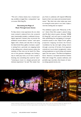 %u201cThis isn%u2019t a history lesson, but a musical journey, carefully arranged like a composition,%u201d says co-curator Shih-Fang Ma .Recreating the Magic of Music Through Iconic ScenesTo help visitors truly experience the era when music existed in physical form, the curatorial team intentionally avoided a traditional chronological approach. Instead, they structured the exhibition around distinct %u201cscenes:%u201d each space begins with a theme, and only then is the song list determined. Every gallery recreates a specific setting from a particular era: stepping inside is like walking into a shared memory, where the melodies of that time can be heard. For Masa, one of the greatest challenges was finding a way to make pop music, an art form rooted in listening, into something that could be %u201cseen.%u201d %u201cListening to music is a deeply personal and intimate experience,%u201d he said. %u201cNo matter how you frame it, audiences will respond differently based on their own tastes and emotional attachments.%u201d %u201cBut that%u2019s also what makes pop music so moving. At some point in our lives, it plays a role that nothing else can replace.%u201dThe exhibition opens with %u201cMemories in Music,%u201d where Chen Da%u2019s yueqin is placed alongside Wu Bai%u2019s electric guitar, allowing %u201c%u601d%u60f3%u8d77(Si Xiang Qi)%u201d and rock music to stand side by side, symbolizing the overlapping of cross-generational sounds. In the %u201cTaipei Circle%u201d gallery, projection mapping recreates the famous roundabout by day and night, taking visitors through a journey of formats, from Japanese colonial-era kua-%u00e1-tsheh (songbooks), radios, and gramophones to record shops and cassette tapes. The next space, %u201cThe Electrical Appliance Store,%u201d features a recreated storefront window filled with vintage TVs, cassette walkmans, and portable tape recorders, like drawers of memory being opened one by one.Instead of following a traditional chronological sequence, the curatorial team invites visitors to step into immersive settings from different eras and hear the music of each time and place. From left to right: exhibition rooms%u201cTaipei Circle,%u201d %u201cThe Electrical Appliance Store,%u201d and %u201cThe Train.%u201d024025Melodies Made Tangible
