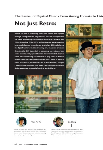 Before the rise of streaming, music was shared and enjoyed through analog formats: vinyl records became widespread in the 1960s, followed by cassette tapes and CDs in the 1970s and 1980s. In the late 1990s, MP3s and the internet began changing how people listened to music, and by the late 2000s, platforms like Spotify ushered in the streaming era. In just six or seven decades, the shift from vinyl to streaming has reshaped the entire industry. Yet physical formats haven%u2019t vanished; they%u2019ve taken on new meaning and continue to play a role in today%u2019s musical landscape. What kind of future awaits music in physical form? Tsan-Pin Yu, founder of Kind of Blue Records, and Jim Chang, founder of Datao Vinyl, share their thoughts on the enduring power and potential of music in physical form.Not Just Retro:The Revival of Physical Music - From Analog Formats to ListeTsan-Pin YuJim ChangFounder of Kind of Blue Records, a shop dedicated to cassette tapes. In 2024, he opened KISSA by KOB, a coffee shop themed around Taiwanese-style music aesthetics, expanding the everyday imagination of analog music.Founder of DaTao Vinyl ZhongLi Store and DaTao Vinyl Taipei Music Center Store, who opened his first physical store in Zhongli, Taoyuan in 2009. In 2022, he brought his shop to TMC, continuing his mission to promote physical music.028029Melodies Made Tangible