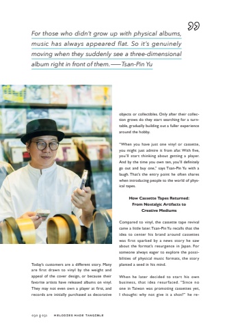 Today%u2019s customers are a different story. Many are first drawn to vinyl by the weight and appeal of the cover design, or because their favorite artists have released albums on vinyl. They may not even own a player at first, and records are initially purchased as decorative objects or collectibles. Only after their collection grows do they start searching for a turntable, gradually building out a fuller experience around the hobby.%u201cWhen you have just one vinyl or cassette, you might just admire it from afar. With five, you%u2019ll start thinking about getting a player. And by the time you own ten, you%u2019ll definitely go out and buy one,%u201d says Tsan-Pin Yu with a laugh. That%u2019s the entry point he often shares when introducing people to the world of physical tapes.How Cassette Tapes Returned: From Nostalgic Artifacts to Creative MediumsCompared to vinyl, the cassette tape revival came a little later. Tsan-Pin Yu recalls that the idea to center his brand around cassettes was first sparked by a news story he saw about the format%u2019s resurgence in Japan. For someone always eager to explore the possibilities of physical music formats, the story planted a seed in his mind.When he later decided to start his own business, that idea resurfaced. %u201cSince no one in Taiwan was promoting cassettes yet, I thought: why not give it a shot?%u201d he reFor those who didn%u2019t grow up with physical albums, music has always appeared flat. So it%u2019s genuinely moving when they suddenly see a three-dimensional album right in front of them.%u2014Tsan-Pin Yu030031Melodies Made Tangible