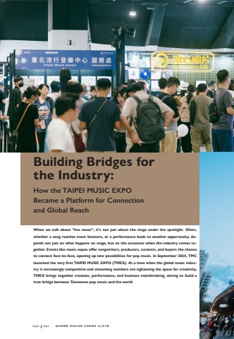 Where Sound Comes AliveBuilding Bridges for the Industry:How the TAIPEI MUSIC EXPO Became a Platform for Connection and Global ReachWhen we talk about %u201clive music%u201d, it%u2019s not just about the stage under the spotlight. Often, whether a song reaches more listeners, or a performance leads to another opportunity, depends not just on what happens on stage, but on the occasions when the industry comes together. Events like music expos offer songwriters, producers, curators, and buyers the chance to connect face-to-face, opening up new possibilities for pop music. In September 2024, TMC launched the very first TAIPEI MUSIC EXPO (TMEX). At a time when the global music industry is increasingly competitive and streaming numbers are tightening the space for creativity, TMEX brings together creation, performance, and business matchmaking, aiming to build a true bridge between Taiwanese pop music and the world.040041