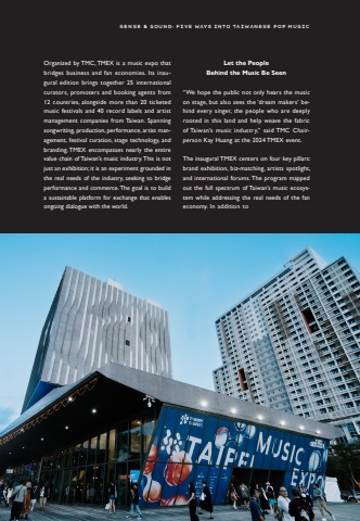 Organized by TMC, TMEX is a music expo that bridges business and fan economies. Its inaugural edition brings together 25 international curators, promoters and booking agents from 12 countries, alongside more than 20 ticketed music festivals and 40 record labels and artist management companies from Taiwan. Spanning songwriting, production, performance, artist management, festival curation, stage technology, and branding, TMEX encompasses nearly the entire value chain of Taiwan%u2019s music industry. This is not just an exhibition; it is an experiment grounded in the real needs of the industry, seeking to bridge performance and commerce. The goal is to build a sustainable platform for exchange that enables ongoing dialogue with the world.Let the People Behind the Music Be Seen%u201cWe hope the public not only hears the music on stage, but also sees the %u2018dream makers%u2019 behind every singer, the people who are deeply rooted in this land and help weave the fabric of Taiwan%u2019s music industry,%u201d said TMC Chairperson Kay Huang at the 2024 TMEX event.The inaugural TMEX centers on four key pillars: brand exhibition, biz-matching, artists spotlight, and international forums. The program mapped out the full spectrum of Taiwan%u2019s music ecosystem while addressing the real needs of the fan economy. In addition to offering international Sense & Sound: Five Ways into Taiwanese Pop Music