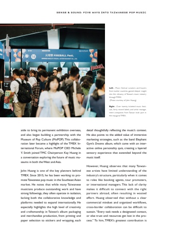 Sense & Sound: Five Ways into Taiwanese Pop Musicattle to bring its permanent exhibition overseas, and also began building a partnership with the Museum of Pop Culture (MoPOP). This collaboration later became a highlight of the TMEX International Forum, where MoPOP CEO Michele Y. Smith joined TMC Chairperson Kay Huang in a conversation exploring the future of music museums in both the West and Asia.John Huang is one of the key planners behind TMEX. Since 2015, he has been working to promote Taiwanese pop music in the Southeast Asian market. He notes that while many Taiwanese musicians produce outstanding work and have strong followings, they often operate in isolation, lacking both the collaborative knowledge and platforms needed to expand internationally. He especially highlights the high level of creativity and craftsmanship in Taiwan%u2019s album packaging and merchandise production, from printing and paper selection to stickers and wrapping, each detail thoughtfully reflecting the music%u2019s context. He also points to the added value of immersive marketing strategies, such as the band Elephant Gym%u2019s Dreams album, which came with an interactive online personality quiz, creating a layered sensory experience that extended beyond the music itself.However, Huang observes that many Taiwanese artists have limited understanding of the industry%u2019s structure, particularly when it comes to roles like booking agents, tour promoters, or international managers. This lack of clarity makes it difficult to connect with the right partners abroad, often resulting in wasted effort. Huang observed that without a clear commercial mindset and organized workflows, cross-border collaboration can be difficult to sustain. %u201cEvery task needs a designated contact, or else trust and resources get lost in the process.%u201d To him, TMEX%u2019s greatest contribution is LeftMusic festival curators and buyers from twelve countries gained deeper insight into the vibrancy of Taiwan%u2019s music industry through TMEX. (Photo courtesy of John Huang)RightOver twenty ticketed music festivals, forty record labels, and artist management companies from Taiwan took part in the inaugural TMEX.