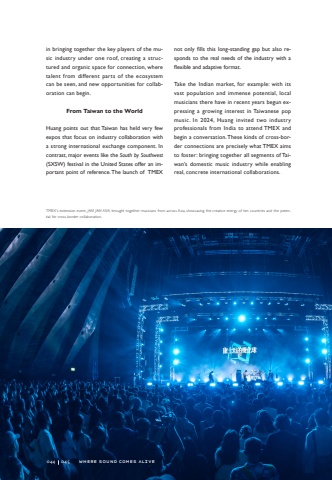 in bringing together the key players of the music industry under one roof, creating a structured and organic space for connection, where talent from different parts of the ecosystem can be seen, and new opportunities for collaboration can begin.From Taiwan to the WorldHuang points out that Taiwan has held very few expos that focus on industry collaboration with a strong international exchange component. In contrast, major events like the South by Southwest(SXSW) festival in the United States offer an important point of reference. The launch of TMEX not only fills this long-standing gap but also responds to the real needs of the industry with a flexible and adaptive format.Take the Indian market, for example: with its vast population and immense potential, local musicians there have in recent years begun expressing a growing interest in Taiwanese pop music. In 2024, Huang invited two industry professionals from India to attend TMEX and begin a conversation. These kinds of cross-border connections are precisely what TMEX aims to foster: bringing together all segments of Taiwan%u2019s domestic music industry while enabling real, concrete international collaborations.TMEX%u2019s extension event, JAM JAM ASIA, brought together musicians from across Asia, showcasing the creative energy of ten countries and the potential for cross-border collaboration.Where Sound Comes Alive044045