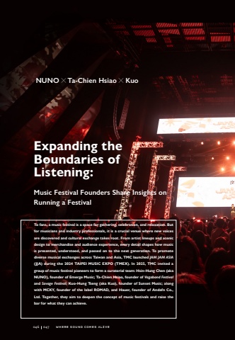 Where Sound Comes AliveTo fans, a music festival is a space for gathering, celebration, and relaxation. But for musicians and industry professionals, it is a crucial venue where new voices are discovered and cultural exchange takes root. From artist lineups and scenic design to merchandise and audience experience, every detail shapes how music is presented, understood, and passed on to the next generation. To promote diverse musical exchanges across Taiwan and Asia, TMC launched JAM JAM ASIA(JJA) during the 2024 TAIPEI MUSIC EXPO (TMEX). In 2025, TMC invited a group of music festival pioneers to form a curatorial team: Hsin-Hung Chen (aka NUNO), founder of Emerge Music; Ta-Chien Hsiao, founder of Vagabond Festivaland Savage Festival; Kuo-Hung Tseng (aka Kuo), founder of Sunset Music; along with MCKY, founder of the label ROMAD, and Hauer, founder of Andafn Co., Ltd. Together, they aim to deepen the concept of music festivals and raise the bar for what they can achieve.Expanding the Boundaries of Listening:Music Festival Founders Share Insights on Running a FestivalNUNO %u2573 Ta-Chien Hsiao %u2573 Kuo 046047