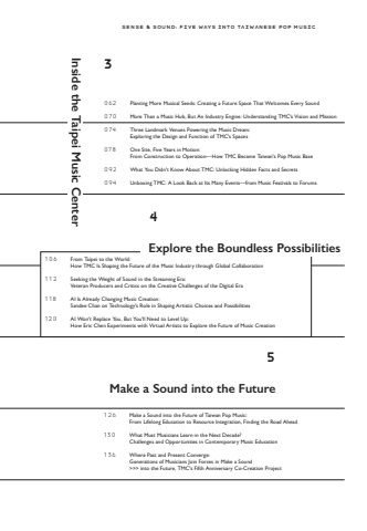 Sense & Sound: Five Ways into Taiwanese Pop Music5Make a Sound into the Future1 06From Taipei to the World: How TMC Is Shaping the Future of the Music Industry through Global Collaboration112Seeking the Weight of Sound in the Streaming Era: Veteran Producers and Critics on the Creative Challenges of the Digital Era118AI Is Already Changing Music Creation: Sandee Chan on Technology's Role in Shaping Artistic Choices and Possibilities120AI Won't Replace You, But You'll Need to Level Up: How Eric Chen Experiments with Virtual Artists to Explore the Future of Music Creation1 26Make a Sound into the Future of Taiwan Pop Music: From Lifelong Education to Resource Integration, Finding the Road Ahead130What Must Musicians Learn in the Next Decade? Challenges and Opportunities in Contemporary Music Education1 36Where Past and Present Converge: Generations of Musicians Join Forces in Make a Sound >>> into the Future, TMC's Fifth Anniversary Co-Creation Project3Inside the Taipei Music Center4Explore the Boundless Possibilities062Planting More Musical Seeds: Creating a Future Space That Welcomes Every Sound070More Than a Music Hub, But An Industry Engine: Understanding TMC's Vision and Mission074Three Landmark Venues Powering the Music Dream: Exploring the Design and Function of TMC's Spaces078One Site, Five Years in Motion: From Construction to Operation%u2014How TMC Became Taiwan's Pop Music Base092What You Didn't Know About TMC: Unlocking Hidden Facts and Secrets094Unboxing TMC: A Look Back at Its Many Events%u2014from Music Festivals to Forums