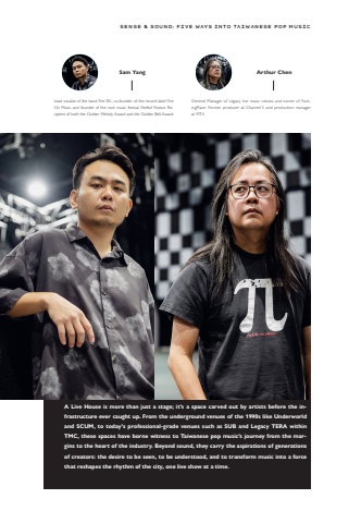 Sense & Sound: Five Ways into Taiwanese Pop MusicA Live House is more than just a stage; it%u2019s a space carved out by artists before the infrastructure ever caught up. From the underground venues of the 1990s like Underworld and SCUM, to today%u2019s professional-grade venues such as SUB and Legacy TERA within TMC, these spaces have borne witness to Taiwanese pop music%u2019s journey from the margins to the heart of the industry. Beyond sound, they carry the aspirations of generations of creators: the desire to be seen, to be understood, and to transform music into a force that reshapes the rhythm of the city, one live show at a time.Sam YangArthur ChenLead vocalist of the band Fire EX., co-founder of the record label Fire On Music, and founder of the rock music festival FireBall Festival. Recipient of both the Golden Melody Award and the Golden Bell Award.General Manager of Legacy live music venues and owner of FuckingPlace. Former producer at Channel V and production manager at MTV.