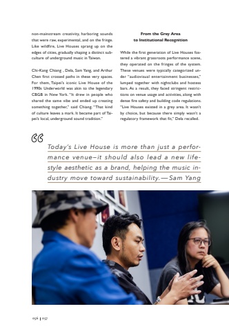 non-mainstream creativity, harboring sounds that were raw, experimental, and on the fringe. Like wildfire, Live Houses sprang up on the edges of cities, gradually shaping a distinct subculture of underground music in Taiwan.Chi-Kang Chiang , Dela, Sam Yang, and Arthur Chen first crossed paths in these very spaces. For them, Taipei%u2019s iconic Live House of the 1990s Underworld was akin to the legendary CBGB in New York. %u201cIt drew in people who shared the same vibe and ended up creating something together,%u201d said Chiang. %u201cThat kind of culture leaves a mark. It became part of Taipei%u2019s local, underground sound tradition.%u201dFrom the Grey Area to Institutional RecognitionWhile the first generation of Live Houses fostered a vibrant grassroots performance scene, they operated on the fringes of the system. These venues were typically categorized under %u201caudiovisual entertainment businesses,%u201d lumped together with nightclubs and hostess bars. As a result, they faced stringent restrictions on venue usage and activities, along with dense fire safety and building code regulations. %u201cLive Houses existed in a grey area. It wasn%u2019t by choice, but because there simply wasn%u2019t a regulatory framework that fit,%u201d Dela recalled.Today%u2019s Live House is more than just a performance venue%u2014it should also lead a new lifestyle aesthetic as a brand, helping the music industry move toward sustainability.%u2014Sam Yang056057