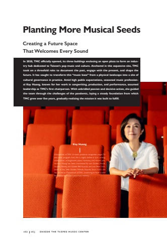 inside the Taipei Music CenterPlanting More Musical SeedsCreating a Future Space That Welcomes Every SoundChairperson of TMC. A music producer, songwriter, singer, TV and radio program host, she is highly skilled in lyric writing, composition, arrangement, piano, harmony, and record production. Huang has been nominated for the Golden Horse, Golden Melody, and Golden Bell Awards, and won Best Composer at the 24th Golden Melody Awards. Since 2020, she has served as Chairperson of TMC, continuing to build a solid foundation for Taiwan%u2019s pop music industry.Kay HuangIn 2020, TMC officially opened, its three buildings enclosing an open plaza to form an industry hub dedicated to Taiwan%u2019s pop music and culture. Anchored in this expansive site, TMC took on a threefold role: to document the past, engage with the present, and shape the future. It has sought to transform this %u201cmusic base%u201d from a physical landscape into a site of cultural governance in practice. Amid high public expectations, seasoned music professional Kay Huang, known for her work in songwriting, production, and performance, assumed leadership as TMC%u2019s first chairperson. With unbridled passion and decisive action, she guided the team through the challenges of the pandemic, laying a steady foundation from which TMC grew over five years, gradually realizing the mission it was built to fulfill.062063