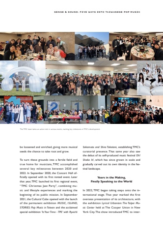 Sense & Sound: Five Ways into Taiwanese Pop Musicbe loosened and enriched, giving more musical seeds the chance to take root and grow.To turn these grounds into a fertile field and true home for musicians, TMC accomplished several key milestones between 2020 and 2022. In September 2020, the Concert Hall officially opened with its first rented event. Later that year, TMC launched its first regional event, %u201cTMC Christmas Jazz Party%u201d, combining music and lifestyle experiences and marking the beginning of its public mission. In September 2021, the Cultural Cube opened with the launch of the permanent exhibition MUSIC, ISLAND, STORIES: Pop Music in Taiwan and the acclaimed special exhibition %u2018Is Your Time - TPE%u2019 with Ryuichi Sakamoto and Shiro Takatani, establishing TMC%u2019s curatorial presence. That same year also saw the debut of its self-produced music festival Oh! Shake It!, which has since grown in scale and gradually carved out its own identity in the festival landscape.Years in the Making, Finally Speaking to the WorldIn 2022, TMC began taking steps onto the international stage. That year marked the first overseas presentation of its architecture, with the exhibition Lyrical Urbanism: The Taipei Music Center held at The Cooper Union in New York City. The show introduced TMC to interThe TMC team takes an active role in various events, marking key milestones in TMC%u2019s development.