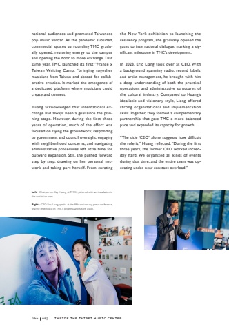 inside the Taipei Music Centernational audiences and promoted Taiwanese pop music abroad. As the pandemic subsided, commercial spaces surrounding TMC gradually opened, restoring energy to the campus and opening the door to more exchange. That same year, TMC launched its first %u201cFrance x Taiwan Writing Camp, %u201dbringing together musicians from Taiwan and abroad for collaborative creation. It marked the emergence of a dedicated platform where musicians could create and connect.Huang acknowledged that international exchange had always been a goal since the planning stage. However, during the first three years of operation, much of the effort was focused on laying the groundwork, responding to government and council oversight, engaging with neighborhood concerns, and navigating administrative procedures left little time for outward expansion. Still, she pushed forward step by step, drawing on her personal network and taking part herself. From curating the New York exhibition to launching the residency program, she gradually opened the gates to international dialogue, marking a significant milestone in TMC%u2019s development.In 2023, Eric Liang took over as CEO. With a background spanning radio, record labels, and artist management, he brought with him a deep understanding of both the practical operations and administrative structures of the cultural industry. Compared to Huang%u2019s idealistic and visionary style, Liang offered strong organizational and implementation skills. Together, they formed a complementary partnership that gave TMC a more balanced pace and expanded its capacity for growth.%u201cThe title %u2018CEO%u2019 alone suggests how difficult the role is,%u201d Huang reflected. %u201cDuring the first three years, the former CEO worked incredibly hard. We organized all kinds of events during that time, and the entire team was operating under near-constant overload.%u201dLeftChairperson Kay Huang at TMEX, pictured with an installation in the exhibition areaRightCEO Eric Liang speaks at the fifth-anniversary press conference, sharing reflections on TMC%u2019s progress and future vision.066067