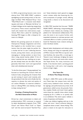 inside the Taipei Music CenterIn 2024, programming became even more diverse, from %u201cTMC NEW STAR,%u201d a platform spotlighting up-and-coming artists, to the nostalgic hit-filled %u201cTMC Weekend Party;%u201d from %u201cWoof Woof: Live!,%u201d a crossover event blending pets and music, to %u201cBetween the Verse,%u201d an in-depth dialogue series exploring songwriting and poetry. These events expanded TMC%u2019s reach and created rich, multi-sensory experiences. More than a place for watching and listening, TMC began to offer a blueprint for music as a lifestyle.Behind this growing spectrum of events is Chairperson Huang%u2019s imagination and drive. She laughed as she recalled how a casual instinct that the plaza might be perfect for a market led her to start collecting favorite brands, jotting them down, and personally messaging or visiting vendors to learn from them. Liang, seated nearby, added, %u201cA lot of times I assumed she was reaching out to people she already knew, but she didn%u2019t. She just genuinely liked their work and approached them with wholehearted sincerity.%u201d%u201cIn the first three years,%u201d Huang explained, %u201cwe focused on launching the Concert Hall and Cultural Cube, and getting the Creative Hub up and running. It wasn%u2019t until recently, with the groundwork laid, that we%u2019ve finally had the capacity to elevate the scale and quality of our events. Whether it%u2019s external collaborations or refining TMC%u2019s own identity, we hope to keep raising the bar.%u201dCreating a Training Ground for the Next Generation of MusicDriven by a dual commitment to ideals and professionalism, TMC continues to expand its talent development programs. From %u201cTMC Cloud%u201d and %u201cSenior Music Club%u201d to %u201cOpen Lab%u201d and the soon-to-launch %u201cStarlink Project,%u201d these initiatives reach upward to engage senior citizens while also fostering the creative ecosystems of younger artists, offering rising bands a chance to be discovered and recognized.In 2024, TMC launched the first-ever %u201cTAIPEI MUSIC EXPO,%u201d addressing a long-standing gap in Taiwan%u2019s music industry by creating a new platform for international collaborations. This year, the event is set to grow further, with expanded invitations to overseas partners and continued efforts to build a practical springboard for Taiwanese music creators aiming to enter the Asian market.Beyond talent development and industry platforms, Huang and Liang are especially proud of TMC%u2019s Concert Hall. With its top-tier technical facilities, the venue fills a crucial gap in Taiwan%u2019s music landscape, bridging the space between live houses and arena-scale venues like Taipei Arena. For many musicians and bands, it has become both a proving ground for honing their craft and a vital stepping stone to larger stages.Five Years On: A Home That Keeps GrowingOn April 1, 2025, TMC marks its fifth anniversary. These days, the campus hums with life nearly every weekend: music markets, mini fan signings, and performances by artists of all generations unfold across the grounds. Families, couples, friends, and music lovers gather, some drawn by a specific show, others simply stopping by for a coffee or to quietly take in an exhibition. The entire space radiates a sense of openness and freedom.%u201cI often see children laughing with joy in the plaza, and once I heard someone playing a saxophone alone at dusk,%u201d shares Huang. %u201cThis place is meant to be open for everyone to 068069