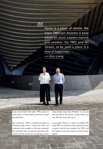 Sense & Sound: Five Ways into Taiwanese Pop Musicenjoy music freely.%u201d She adds, %u201cTMC places no limits; this is a home where all forms of music are welcome.%u201dShe continues, %u201cTMC is already the home of Taiwanese pop music. I hope this home can welcome more people in, and also empower the musicians here to step out and share their sound with the world. To me, sharing is something deeply important. Whether or not you see yourself as the %u2018owner%u2019 of this home, you can still treat it as your own.%u201dLiang adds,%u201cHome is a place of shelter. We hope TMC can become a base where all music creators nourish one another. For TMC and for Taiwan, to be such a place is a kind of happiness.%u201dHome is a place of shelter. We hope TMC can become a base where all music creators nourish one another. For TMC and for Taiwan, to be such a place is a kind of happiness.%u2014Eric Liang