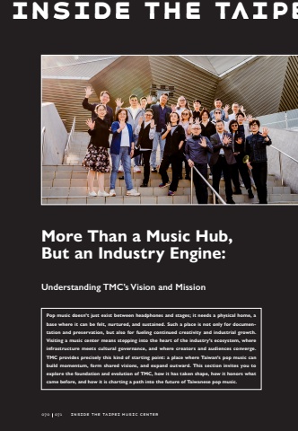 Inside the TaipeInside the Taipeinside the Taipei Music CenterMore Than a Music Hub, But an Industry Engine: Understanding TMC%u2019s Vision and MissionPop music doesn%u2019t just exist between headphones and stages; it needs a physical home, a base where it can be felt, nurtured, and sustained. Such a place is not only for documentation and preservation, but also for fueling continued creativity and industrial growth. Visiting a music center means stepping into the heart of the industry%u2019s ecosystem, where infrastructure meets cultural governance, and where creators and audiences converge. TMC provides precisely this kind of starting point: a place where Taiwan%u2019s pop music can build momentum, form shared visions, and expand outward. This section invites you to explore the foundation and evolution of TMC, how it has taken shape, how it honors what came before, and how it is charting a path into the future of Taiwanese pop music.070071