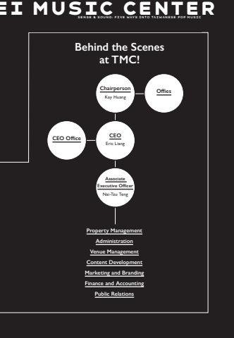 Sense & Sound: Five Ways into Taiwanese Pop MusicBehind the Scenes at TMC!Property ManagementAdministrationVenue ManagementContent DevelopmentMarketing and BrandingFinance and AccountingPublic RelationsCEO OfficeOffiesChairpersonKay HuangCEOEric LiangAssociate Executive OfficerNai-Tzu Teng