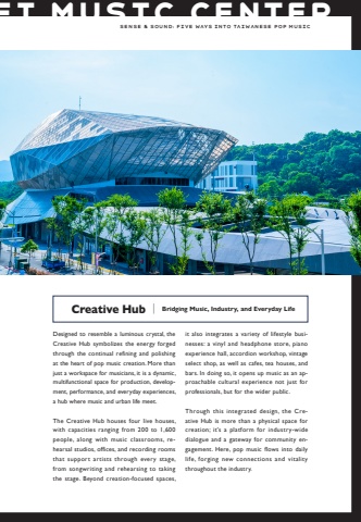 Sense & Sound: Five Ways into Taiwanese Pop MusicDesigned to resemble a luminous crystal, the Creative Hub symbolizes the energy forged through the continual refining and polishing at the heart of pop music creation. More than just a workspace for musicians, it is a dynamic, multifunctional space for production, development, performance, and everyday experiences, a hub where music and urban life meet.The Creative Hub houses four live houses, with capacities ranging from 200 to 1,600 people, along with music classrooms, rehearsal studios, offices, and recording rooms that support artists through every stage, from songwriting and rehearsing to taking the stage. Beyond creation-focused spaces, it also integrates a variety of lifestyle businesses: a vinyl and headphone store, piano experience hall, accordion workshop, vintage select shop, as well as cafes, tea houses, and bars. In doing so, it opens up music as an approachable cultural experience not just for professionals, but for the wider public.Through this integrated design, the Creative Hub is more than a physical space for creation; it%u2019s a platform for industry-wide dialogue and a gateway for community engagement. Here, pop music flows into daily life, forging new connections and vitality throughout the industry.Creative HubBridging Music, Industry, and Everyday Life