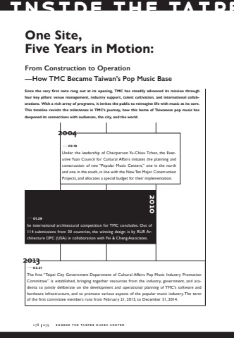 Inside the Taipe%u201401.29he international architectural competition for TMC concludes. Out of 114 submissions from 30 countries, the winning design is by RUR Architecture DPC (USA) in collaboration with Fei & Cheng Associates.2010%u201402.21The first %u201cTaipei City Government Department of Cultural Affairs Pop Music Industry Promotion Committee%u201d is established, bringing together resources from the industry, government, and academia to jointly deliberate on the development and operational planning of TMC%u2019s software and hardware infrastructure, and to promote various aspects of the popular music industry. The term of the first committee members runs from February 21, 2013, to December 31, 2014.2013One Site, Five Years in Motion: From Construction to Operation%u2014How TMC Became Taiwan%u2019s Pop Music Base02.18Under the leadership of Chairperson Yu-Chiou Tchen, the Executive Yuan Council for Cultural Affairs initiates the planning and construction of two %u201cPopular Music Centers,%u201d one in the north and one in the south, in line with the New Ten Major Construction Projects, and allocates a special budget for their implementation.2004Since the very first note rang out at its opening, TMC has steadily advanced its mission through four key pillars: venue management, industry support, talent cultivation, and international collaborations. With a rich array of programs, it invites the public to reimagine life with music at its core. This timeline revisits the milestones in TMC%u2019s journey, how this home of Taiwanese pop music has deepened its connections with audiences, the city, and the world.078079inside the Taipei Music Center