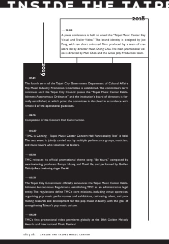 Inside the Taipe01.01The fourth term of the Taipei City Government Department of Cultural Affairs Pop Music Industry Promotion Committee is established. The committee%u2019s term continues until the Taipei City Council passes the %u201cTaipei Music Center Establishment Autonomous Ordinance%u201d and the institution%u2019s board of directors is formally established, at which point the committee is dissolved in accordance with Article 8 of the operational guidelines.%u201402.15Completion of the Concert Hall Construction.04.27%u201cTMC is Coming %u2013 Taipei Music Center Concert Hall Functionality Test%u201d is held. The test event is jointly carried out by multiple performance groups, musicians, and music lovers who volunteer as testers.05.10TMC releases its official promotional theme song, %u201cBe Yours,%u201d composed by award-winning producers Europa Huang and David Ke, and performed by Golden Melody Award-winning singer Eve Ai.%u201405.31The Taipei City Government officially announces the Taipei Music Center Establishment Autonomous Regulations, establishing TMC as an administrative legal entity. The regulations define TMC%u2019s core missions, including venue operation, organizing pop music performances and exhibitions, cultivating talent, and promoting research and development for the pop music industry, with the goal of strengthening Taiwan%u2019s pop music culture.%u201406.29TMC%u2019s first promotional video premieres globally at the 30th Golden Melody Awards and International Music Festival.2019%u201412.05A press conference is held to unveil the %u201cTaipei Music Center Key Visual and Trailer Video.%u201d The brand identity is designed by Joe Fang, with ten short animated films produced by a team of creators led by director Huan-Sheng Chiu. The main promotional video is directed by Muh Chen and the Grass Jelly Production team.2018080081inside the Taipei Music Center