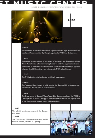 Sense & Sound: Five Ways into Taiwanese Pop Music202008.27The official opening ceremony of the Concert Hall is held.09.05The Concert Hall officially launches with its first ticketed concert, %u201cHi! TMC is Opening.%u201d03.01The first Board of Directors and Board of Supervisors of the Taipei Music Center are established. Veteran musician Kay Huang is appointed as TMC%u2019s first Chairperson.%u201403.03The inaugural joint meeting of the Board of Directors and Supervisors of the Taipei Music Center administrative legal entity is held. The organizational structure of TMC is approved, and veteran music professional Austin Peng is appointed as the first CEO, marking a key milestone in TMC%u2019s official launch.%u201404.01The TMC administrative legal entity is officially inaugurated.%u201408.05The %u201cIndustry Open House%u201d is held, opening the Concert Hall to industry professionals for the first time to tour its facilities.08.22The Department of Cultural Affairs, Taipei City Government hosts the %u201cTMC is Coming: PUNCH Power Unplugged%u201d event to conduct the first full-capacity test of the Concert Hall, drawing nearly 4,000 attendees.