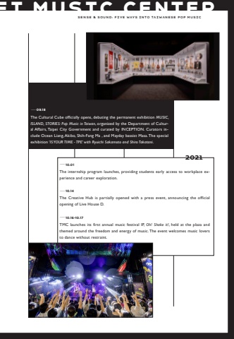 Sense & Sound: Five Ways into Taiwanese Pop Music09.18The Cultural Cube officially opens, debuting the permanent exhibition MUSIC, ISLAND, STORIES: Pop Music in Taiwan, organized by the Department of Cultural Affairs, Taipei City Government and curated by INCEPTION. Curators include Ocean Liang, Akibo, Shih-Fang Ma , and Mayday bassist Masa. The special exhibition %u2018IS YOUR TIME - TPE%u2019 with Ryuichi Sakamoto and Shiro Takatani.10.01The internship program launches, providing students early access to workplace experience and career exploration.10.14The Creative Hub is partially opened with a press event, announcing the official opening of Live House D.%u201410.16-10.17TMC launches its first annual music festival IP, Oh! Shake it!, held at the plaza and themed around the freedom and energy of music. The event welcomes music lovers to dance without restraint.2021
