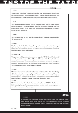 Inside the Taipe03.19-20To promote cultural exchange and the legacy of pop music, TMC organizes %u201cMusic Island Stories%u201d salon series, inviting four cross-generational creative groups to discuss themes such as language, identity, and lyricism, exploring how pop music reflects its times.2022%u201410.23The original %u201cTMC TALK%u201d series launches. The first sessions, titled %u201cNot Alone%u201d and %u201cDon%u2019t Conform,%u201d focus on life and industry themes, inviting creators and professionals to spark conversations and cross-sector exchanges within pop music.11.25TMC launches its open-source %u201cTMC IR Reverb Project,%u201d offering music production professionals a virtual simulation tool. This is released alongside the TMC Dream Echo Studio%u2019s %u201cTMC Sound Lab%u201d to help musicians explore the venue%u2019s unique acoustic properties.%u201412.03TMC is named one of the %u201cTop 10 Creative Space%u201d in La Vie magazine%u2019s 2021 %u201cCreative Awards.%u201d12.05The %u201cSenior Music Club%u201d launches, offering music courses tailored for those aged 60 and up. The first edition focuses on finger drums and encourages relaxed, joyful music-making among older adults.12.24-12.26The year-end holiday celebration debuts an upgraded %u201cTMC Xmas Wonderland,%u201d expanding activities to the Cultural Cube and Creative Hub. Events include musical performances, a Christmas market, circus acts, and parades. In subsequent years, the festivities extend to include performances across shops around the TMC, cultivating a festive music village in Nangang.12.25TMC launches its first self-produced special exhibition, Chen Chih-Yuan: Prodigy of the Generation, honoring a key figure in Taiwan%u2019s pop music industry. The show explores Chen%u2019s influential body of work and publishes an accompanying book titled %u201cUnfading Notes: The Musical Universe of Chen Chih-Yuan.%u201d%u201412.31TMC hosts its first New Year%u2019s Eve celebration, %u201cSunset TMC,%u201d in the Concert Hall, featuring live performances, an outdoor market, movie screenings, and a countdown to welcome the new year.2021084085