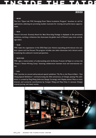 Inside the Taipe09.30The first %u201cOpen Lab: TMC Emerging Music Talent Incubation Program%u201d launches its call for applications, selecting ten promising student musicians for training and performance opportunities.10.01Taiwan%u2019s first-ever Grammy Award for Best Recording Package is displayed in the permanent exhibition, marking a milestone that showcases the global reach of Taiwan%u2019s pop music and design talent.10.08TMC leads the organization of the 2022 Taipei Jazz Festival, expanding performances into outdoor spaces and Live Houses. The program includes new talent showcases and a lecture series, broadening the audience%u2019s musical perspectives.%u201410.31-11.03TMC signs a memorandum of understanding with the Bureau Fran%u00e7ais de Taipei to co-host the %u201cFrance x Taiwan Writing Camp,%u201d fostering collaboration between local and international artists.%u201411.12TMC launches its second self-produced special exhibition, %u201cFly Me to the Moon & Back %u2013 Tom Chang Special Exhibition,\bition is curated by Pang Wang (Informat Design Curating), with Mayday bassist Masa as music director, and curatorial contributions by Cowper Wang and Pulp Chen. It retraces Chang%u2019s musical journey and classic works.2022086087inside the Taipei Music Center