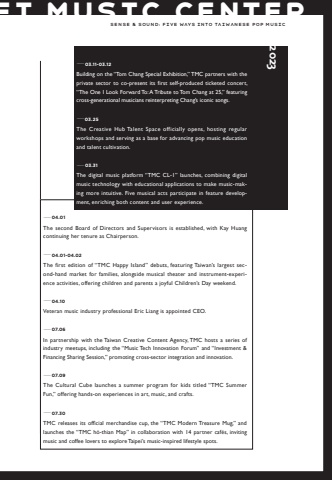 Sense & Sound: Five Ways into Taiwanese Pop Music04.01The second Board of Directors and Supervisors is established, with Kay Huang continuing her tenure as Chairperson.%u201404.01-04.02The first edition of %u201cTMC Happy Island%u201d debuts, featuring Taiwan%u2019s largest second-hand market for families, alongside musical theater and instrument-experience activities, offering children and parents a joyful Children%u2019s Day weekend.04.10Veteran music industry professional Eric Liang is appointed CEO.07.06In partnership with the Taiwan Creative Content Agency, TMC hosts a series of industry meetups, including the %u201cMusic Tech Innovation Forum%u201d and %u201cInvestment & Financing Sharing Session,%u201d promoting cross-sector integration and innovation.07.09The Cultural Cube launches a summer program for kids titled %u201cTMC Summer Fun,%u201d offering hands-on experiences in art, music, and crafts.07.30TMC releases its official merchandise cup, the %u201cTMC Modern Treasure Mug,%u201d and launches the %u201cTMC h%u00f3-thian Map%u201d in collaboration with 14 partner caf%u00e9s, inviting music and coffee lovers to explore Taipei%u2019s music-inspired lifestyle spots.03.11-03.12Building on the %u201cTom Chang Special Exhibition,%u201d TMC partners with the private sector to co-present its first self-produced ticketed concert, %u201cThe One I Look Forward To: A Tribute to Tom Chang at 25,%u201d featuring cross-generational musicians reinterpreting Chang%u2019s iconic songs.%u201403.25The Creative Hub Talent Space officially opens, hosting regular workshops and serving as a base for advancing pop music education and talent cultivation.%u201403.31The digital music platform %u201cTMC CL-1%u201d launches, combining digital music technology with educational applications to make music-making more intuitive. Five musical acts participate in feature development, enriching both content and user experience.2023