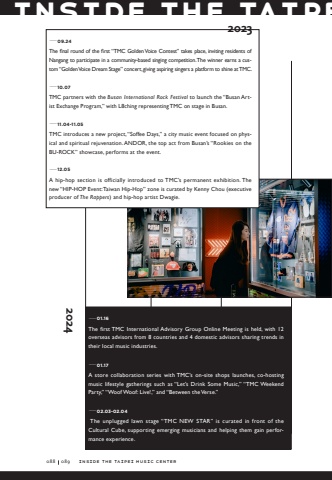 Inside the Taipe09.24The final round of the first %u201cTMC Golden Voice Contest%u201d takes place, inviting residents of Nangang to participate in a community-based singing competition. The winner earns a custom %u201cGolden Voice Dream Stage%u201d concert, giving aspiring singers a platform to shine at TMC.10.07TMC partners with the Busan International Rock Festival to launch the %u201cBusan Artist Exchange Program,%u201d with L8ching representing TMC on stage in Busan.11.04-11.05TMC introduces a new project, %u201cSoffee Days,%u201d a city music event focused on physical and spiritual rejuvenation. ANDOR, the top act from Busan%u2019s %u201cRookies on the BU-ROCK%u201d showcase, performs at the event.12.05A hip-hop section is officially introduced to TMC%u2019s permanent exhibition. The new %u201cHIP-HOP Event: Taiwan Hip-Hop%u201d zone is curated by Kenny Chou (executive producer of The Rappers) and hip-hop artist Dwagie.2024202301.16The first TMC International Advisory Group Online Meeting is held, with 12 overseas advisors from 8 countries and 4 domestic advisors sharing trends in their local music industries.01.17A store collaboration series with TMC%u2019s on-site shops launches, co-hosting music lifestyle gatherings such as %u201cLet%u2019s Drink Some Music,%u201d %u201cTMC Weekend Party,%u201d %u201cWoof Woof: Live!,%u201d and %u201cBetween the Verse.%u201d02.03-02.04 The unplugged lawn stage %u201cTMC NEW STAR%u201d is curated in front of the Cultural Cube, supporting emerging musicians and helping them gain performance experience.088089inside the Taipei Music Center
