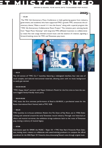 Sense & Sound: Five Ways into Taiwanese Pop Music%u201403.31The 2.0 version of %u201cTMC CL-1%u201d launches, featuring a redesigned interface, four new sets of vocal samples, and tailored instructional materials, allowing users with no music background to easily get started.04.05-04.06%u201cTMC Happy Island%u201d partners with Taipei Children%u2019s Month for the first time to host the season%u2019s biggest family-friendly music party.%u201405.01-05.02TMC hosts the first overseas performance of Road to BU-ROCK, a pre-festival event for the Busan International Rock Festival, held at TMC SUB.%u201405.24TMC launches its in-house exhibition Modern Era: The Dawn of Pop Music, set in 1930s Dadaocheng and centered around the early Taiwanese record industry. Through rare historical artifacts and musical narratives, the exhibition brings audiences back to the roots of Taiwanese pop, tracing a century of musical legacy.07.08Submissions open for SPARK the MUSIC %u2013 Taipei 101 %u00d7 TMC New Year%u2019s Fireworks Music Selection, inviting music creators to collaborate with award-winning producers to compose the official soundtrack for the 2026 Taipei 101 fireworks show, showcasing Taiwan%u2019s voice through original music.%u201403.28 The TMC 5th Anniversary Press Conference is held, gathering guests from industry, government, and academia who have supported TMC%u2019s growth. TMC announces the anniversary theme, %u201cMake a sound >>> into the future,%u201d along with a special program: the %u201cTMC 5th Anniversary Collaborative Music Project.%u201d The initiative pairs winning bands from %u201cTaipei Music Nonstop%u201d with long-time TMC-affiliated musicians to collaboratively create five new songs themed around music and the essence of creation, signaling a forward-looking vision for TMC and Taiwanese pop music.2025