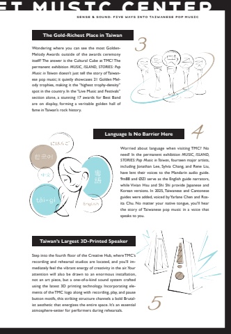 Sense & Sound: Five Ways into Taiwanese Pop MusicWorried about language when visiting TMC? No need! In the permanent exhibition MUSIC, ISLAND, STORIES: Pop Music in Taiwan, fourteen major artists, including Jonathan Lee, Sylvia Chang, and Rene Liu, have lent their voices to the Mandarin audio guide. 9m88 and %u00d8ZI serve as the English guide narrators, while Vivian Hsu and Shi Shi provide Japanese and Korean versions. In 2025, Taiwanese and Cantonese guides were added, voiced by Yarlane Chen and Rosita Chu. No matter your native tongue, you%u2019ll hear the story of Taiwanese pop music in a voice that speaks to you.Step into the fourth floor of the Creative Hub, where TMC%u2019s recording and rehearsal studios are located, and you%u2019ll immediately feel the vibrant energy of creativity in the air. Your attention will also be drawn to an enormous installation, not an art piece, but a one-of-a-kind sound system crafted using the latest 3D printing technology. Incorporating elements of the TMC logo along with recording, play, and pause button motifs, this striking structure channels a bold Brutalist aesthetic that energizes the entire space. It%u2019s an essential atmosphere-setter for performers during rehearsals.Wondering where you can see the most GoldenMelody Awards outside of the awards ceremony itself? The answer is the Cultural Cube at TMC! The permanent exhibition MUSIC, ISLAND, STORIES: Pop Music in Taiwan doesn%u2019t just tell the story of Taiwanese pop music; it quietly showcases 21 Golden Melody trophies, making it the %u201chighest trophy-density%u201d spot in the country. In the %u201cLive Music and Festivals%u201d section alone, a stunning 17 awards for Best Band are on display, forming a veritable golden hall of fame in Taiwan%u2019s rock history.453The Gold-Richest Place in TaiwanLanguage Is No Barrier HereTaiwan%u2019s Largest 3D-Printed Speaker