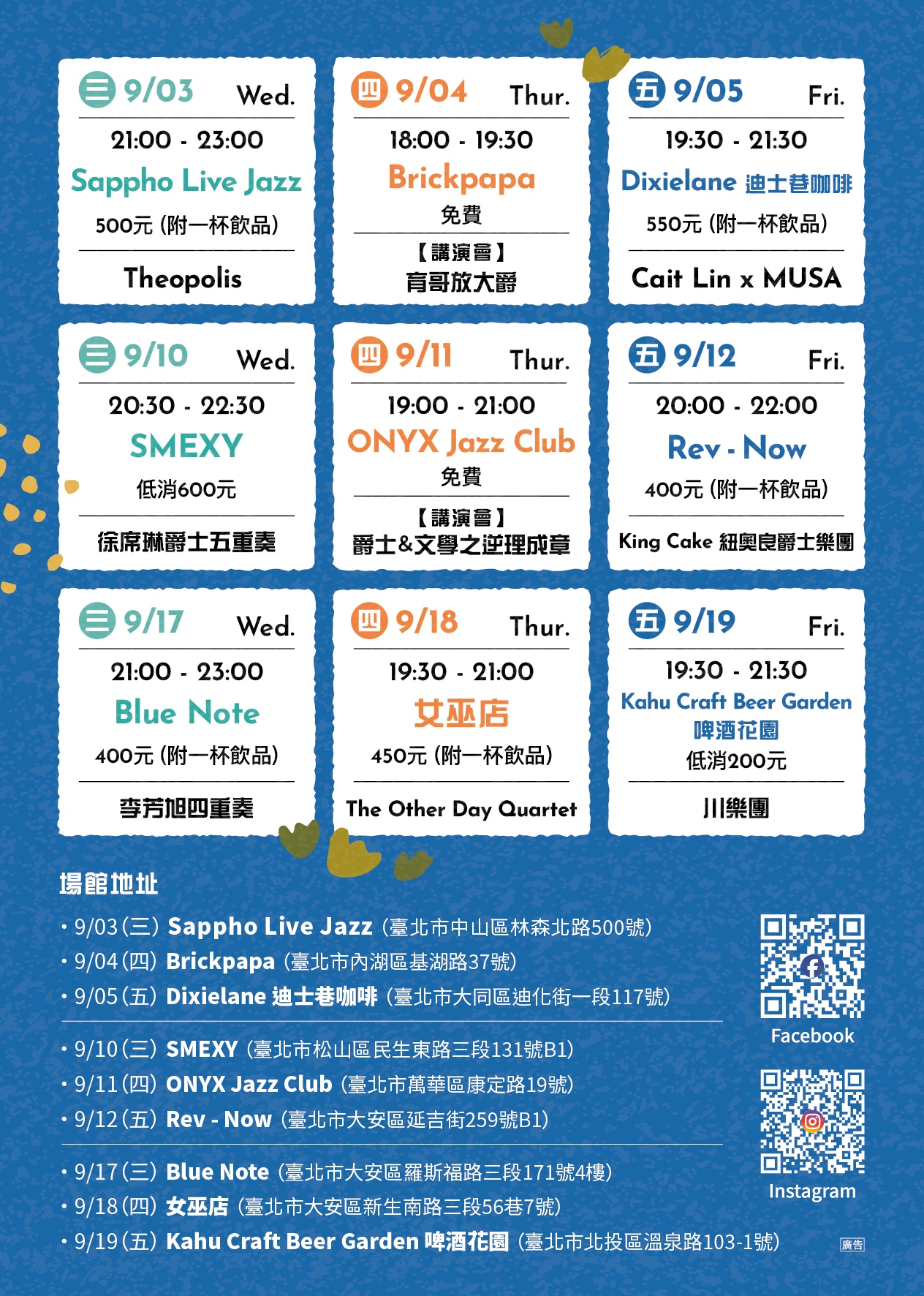 9/03(三)-9/19(五)期間,每周三、四、五,9間爵士Live House。